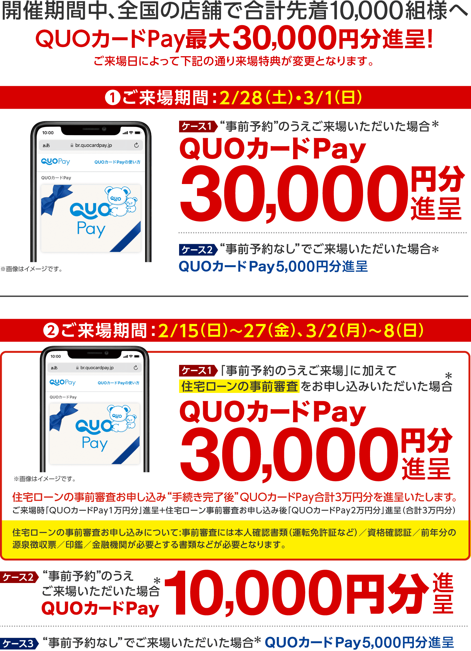 ●フェア期間中に複数店舗へご来場いただいた場合でも、ご来場プレゼントは1回限り(事前予約の場合は予約登録されたご本人様へ)の進呈とさせていただきます。 ●他イベントおよびキャンペーンの来場特典との併用は不可となります。 ●プレゼントの進呈数は限りがあり、なくなり次第終了となります(フェア開催期間中・全店舗合計先着10,000組様限定)。 ●諸事情によりプレゼント内容および開催期間等が変更となる場合があります。 ●[事前予約のお客様]店舗の予約状況によっては、ご予約時間帯等を調整いただく場合があります。 ●事前予約なしでもご来場いただけます。 ●ご本人確認のため、顔写真付き身分証明書のご提示をお願いする場合があります。 ●ご来場者の「ご予約時の情報(ご入力情報等)」と「ご来場時のご提示情報」に相違がある場合、またはご登録情報等に事実と異なる内容が含まれる場合は、特典の進呈をいたしかねます。予めご了承ください。 ●「QUOカードPay」はスマートフォンでご利用いただけます(個人のメールアドレス必須)。 ●「QUOカードPay」はご来場いただいた翌日以降に改めてメール配信にて送付させていただきます(有効期限:発行日から3ヶ年)。 ●審査お申し込み必要書類:事前審査には本人確認書類(運転免許所など)/資格確認証/前年分の源泉徴収票/印鑑/金融機関が必要とする書類などが必要となります。