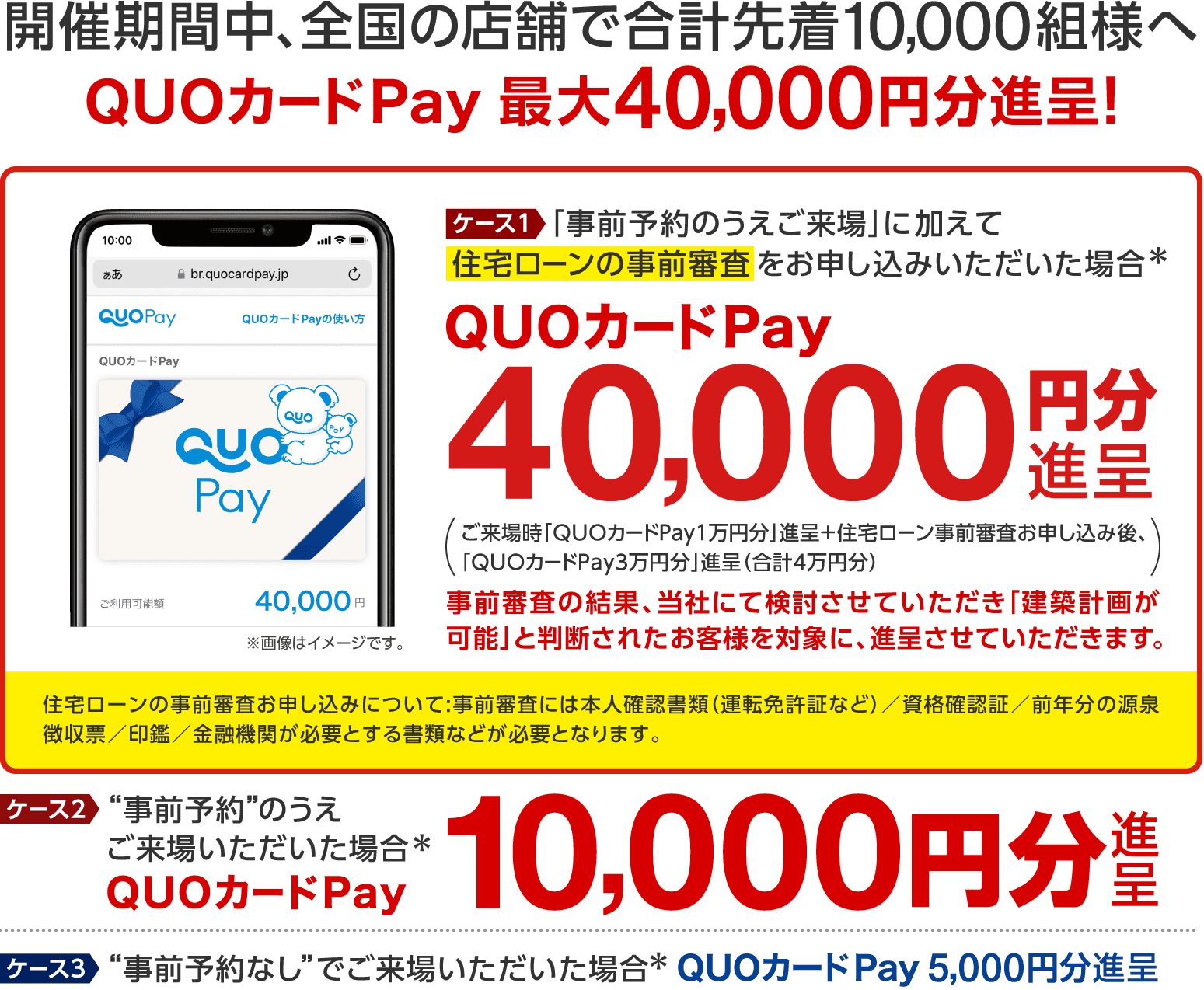 ●フェア期間中に複数店舗へご来場いただいた場合でも、ご来場プレゼントは1回限り(事前予約の場合は予約登録されたご本人様へ)の進呈とさせていただきます。 ●他イベントおよびキャンペーンの来場特典との併用は不可となります。 ●プレゼントの進呈数は限りがあり、なくなり次第終了となります(フェア開催期間中・全店舗合計先着10,000組様限定)。 ●諸事情によりプレゼント内容および開催期間等が変更となる場合があります。 ●[事前予約のお客様]店舗の予約状況によっては、ご予約時間帯等を調整いただく場合があります。 ●事前予約なしでもご来場いただけます。 ●ご本人確認のため、顔写真付き身分証明書のご提示をお願いする場合があります。 ●ご来場者の「ご予約時の情報(ご入力情報等)」と「ご来場時のご提示情報」に相違がある場合、またはご登録情報等に事実と異なる内容が含まれる場合は、特典の進呈をいたしかねます。予めご了承ください。 ●「QUOカードPay」はスマートフォンでご利用いただけます(個人のメールアドレス必須)。 ●「QUOカードPay」はご来場いただいた翌日以降に改めてメール配信にて送付させていただきます(有効期限:発行日から3ヶ年)。 ●審査お申し込み必要書類:事前審査には本人確認書類(運転免許証など)/資格確認証/前年分の源泉徴収票/印鑑/金融機関が必要とする書類などが必要となります。