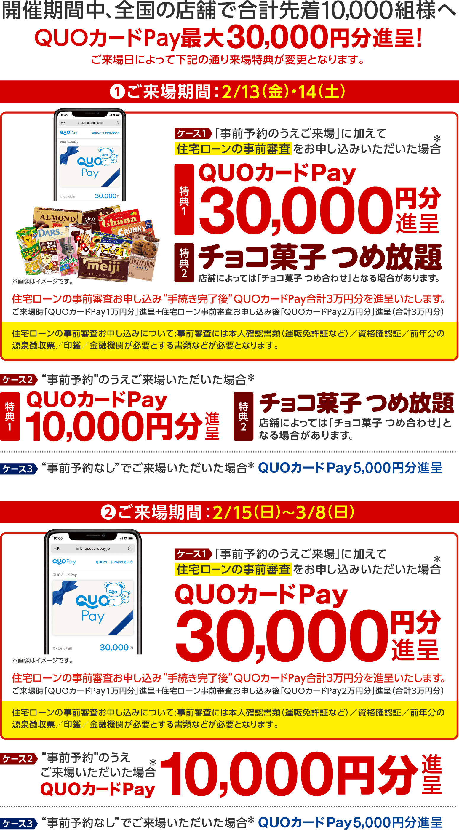 ●フェア期間中に複数店舗へご来場いただいた場合でも、ご来場プレゼントは1回限り(事前予約の場合は予約登録されたご本人様へ)の進呈とさせていただきます。 ●他イベントおよびキャンペーンの来場特典との併用は不可となります。 ●プレゼントの進呈数は限りがあり、なくなり次第終了となります(フェア開催期間中・全店舗合計先着10,000組様限定)。 ●諸事情によりプレゼント内容および開催期間等が変更となる場合があります。 ●[事前予約のお客様]店舗の予約状況によっては、ご予約時間帯等を調整いただく場合があります。 ●事前予約なしでもご来場いただけます。 ●チョコ菓子を入れる袋は弊社指定のものとなります。 ●ご本人確認のため、顔写真付き身分証明書のご提示をお願いする場合があります。 ●ご来場者の「ご予約時の情報(ご入力情報等)」と「ご来場時のご提示情報」に相違がある場合、またはご登録情報等に事実と異なる内容が含まれる場合は、特典の進呈をいたしかねます。予めご了承ください。 ●「QUOカードPay」はスマートフォンでご利用いただけます(個人のメールアドレス必須)。 ●「QUOカードPay」はご来場いただいた翌日以降に改めてメール配信にて送付させていただきます(有効期限:発行日から3ヶ年)。 ●審査お申し込み必要書類:事前審査には本人確認書類(運転免許所など)/資格確認証/前年分の源泉徴収票/印鑑/金融機関が必要とする書類などが必要となります。