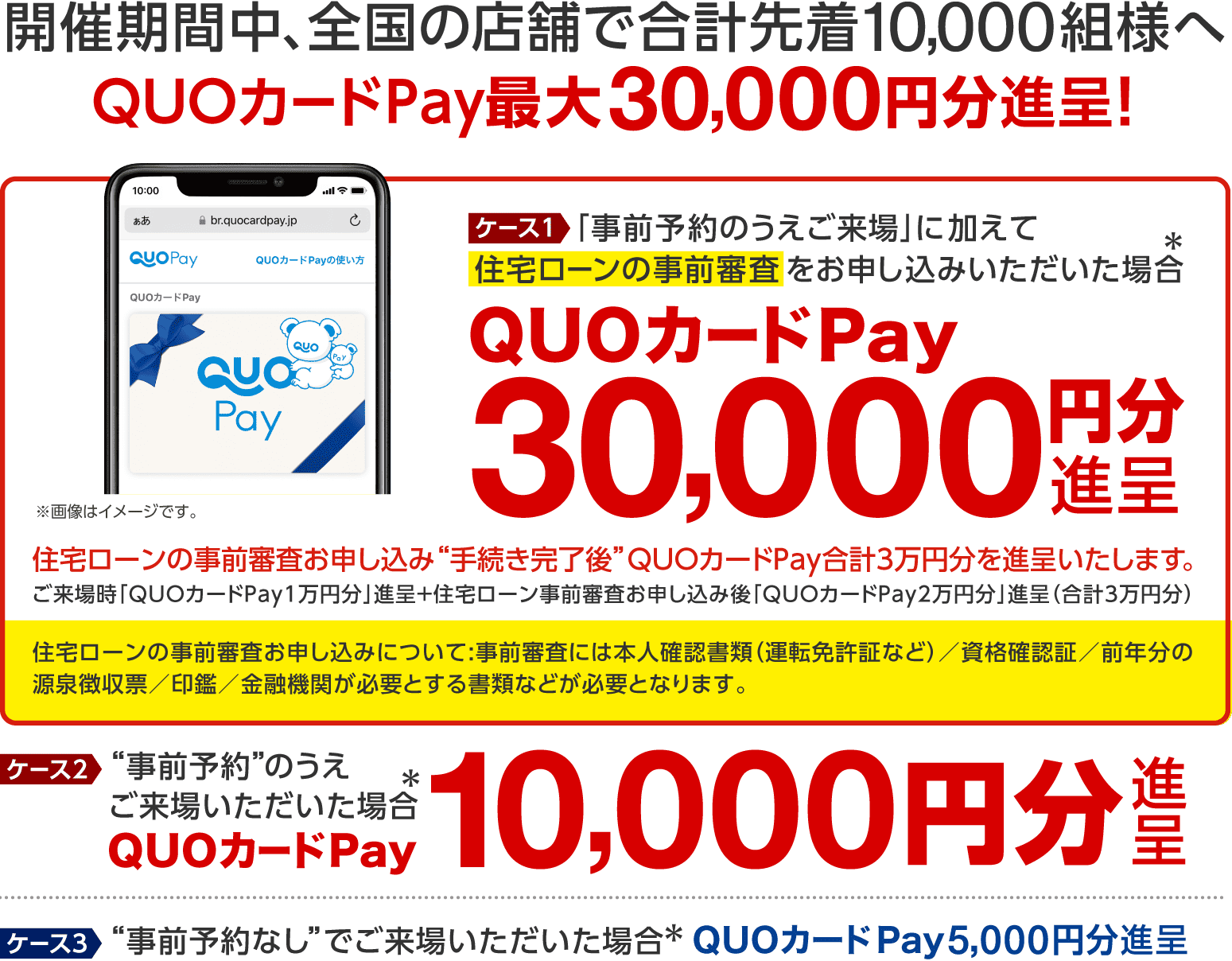 ●フェア期間中に複数店舗へご来場いただいた場合でも、ご来場プレゼントは1回限り(事前予約の場合は予約登録されたご本人様へ)の進呈とさせていただきます。 ●他イベントおよびキャンペーンの来場特典との併用は不可となります。 ●プレゼントの進呈数は限りがあり、なくなり次第終了となります(フェア開催期間中・全店舗合計先着10,000組様限定)。 ●諸事情によりプレゼント内容および開催期間等が変更となる場合があります。 ●[事前予約のお客様]店舗の予約状況によっては、ご予約時間帯等を調整いただく場合があります。 ●事前予約なしでもご来場いただけます。 ●ご本人確認のため、顔写真付き身分証明書のご提示をお願いする場合があります。 ●ご来場者の「ご予約時の情報(ご入力情報等)」と「ご来場時のご提示情報」に相違がある場合、またはご登録情報等に事実と異なる内容が含まれる場合は、特典の進呈をいたしかねます。予めご了承ください。 ●「QUOカードPay」はスマートフォンでご利用いただけます(個人のメールアドレス必須)。 ●「QUOカードPay」はご来場いただいた翌日以降に改めてメール配信にて送付させていただきます(有効期限:発行日から3ヶ年)。 ●審査お申し込み必要書類:事前審査には本人確認書類(運転免許所など)/資格確認証/前年分の源泉徴収票/印鑑/金融機関が必要とする書類などが必要となります。