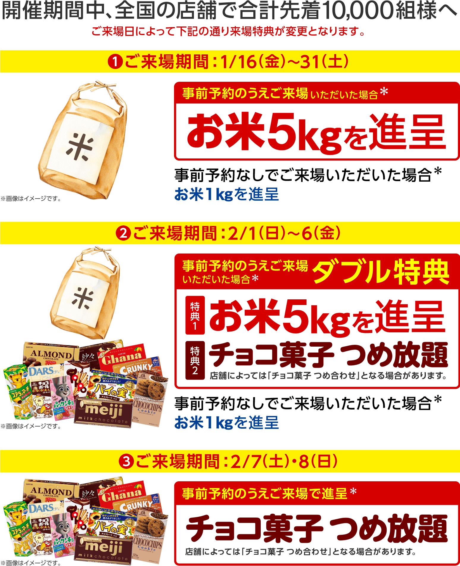 ●フェア期間中に複数店舗へご来場いただいた場合でも、ご来場プレゼントは1回限り(事前予約の場合は予約登録されたご本人様へ)の進呈とさせていただきます。 ●他イベントおよびキャンペーンの来場特典との併用は不可となります。 ●プレゼントの進呈数は限りがあり、なくなり次第終了となります(フェア開催期間中・全店舗合計先着10,000組様限定)。 ●諸事情によりプレゼント内容および開催期間等が変更となる場合があります。 ●[事前予約のお客様]店舗の予約状況によっては、ご予約時間帯等を調整いただく場合があります。 ●事前予約なしでもご来場いただけます。 ●チョコ菓子を入れる袋は弊社指定のものとなります。 ●ご本人確認のため、顔写真付き身分証明書のご提示をお願いする場合があります。●ご来場者の「ご予約時の情報(ご入力情報等)」と「ご来場時のご提示情報」に相違がある場合、またはご登録情報等に事実と異なる内容が含まれる場合は、特典の進呈をいたしかねます。予めご了承ください。