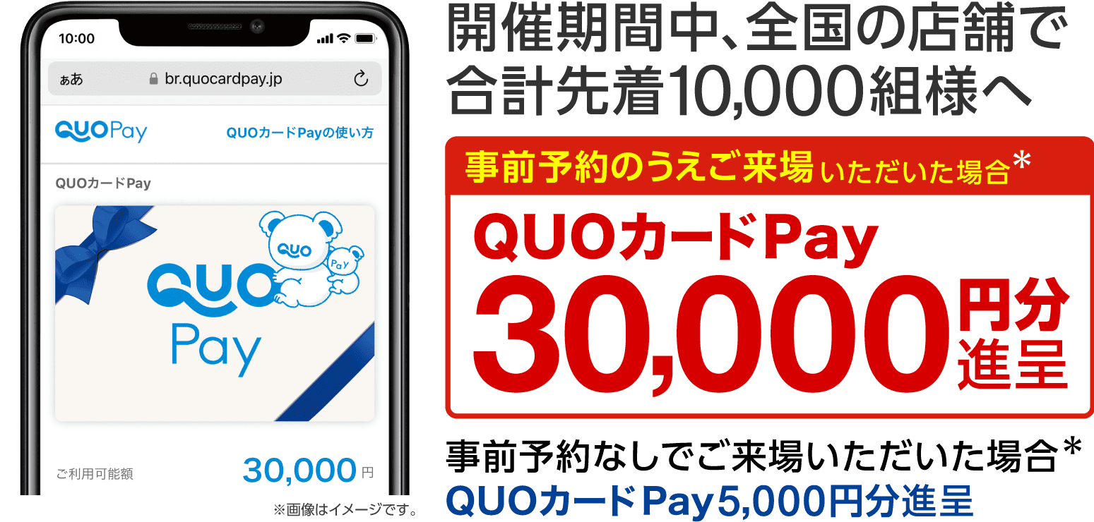 ●フェア期間中に複数店舗へご来場いただいた場合でも、ご来場プレゼントは1回限り(事前予約の場合は予約登録されたご本人様へ)の進呈とさせていただきます。 ●他イベントおよびキャンペーンの来場特典との併用は不可となります。 ●プレゼントの進呈数は限りがあり、なくなり次第終了となります(フェア開催期間中・全店舗合計先着10,000組様限定)。 ●諸事情によりプレゼント内容および開催期間等が変更となる場合があります。 ●[事前予約のお客様]店舗の予約状況によっては、ご予約時間帯等を調整いただく場合があります。 ●事前予約なしでもご来場いただけます。 ●ご本人確認のため、顔写真付き身分証明書のご提示をお願いする場合があります。●ご来場者の「ご予約時の情報(ご入力情報等)」と「ご来場時のご提示情報」に相違がある場合、またはご登録情報等に事実と異なる内容が含まれる場合は、特典の進呈をいたしかねます。予めご了承ください。 ●「QUOカードPay」はスマートフォンでご利用いただけます(個人のメールアドレス必須)。 ●「QUOカードPay」はご来場いただいた翌日以降に改めてメール配信にて送付させていただきます(有効期限:発行日から3ヶ年)。